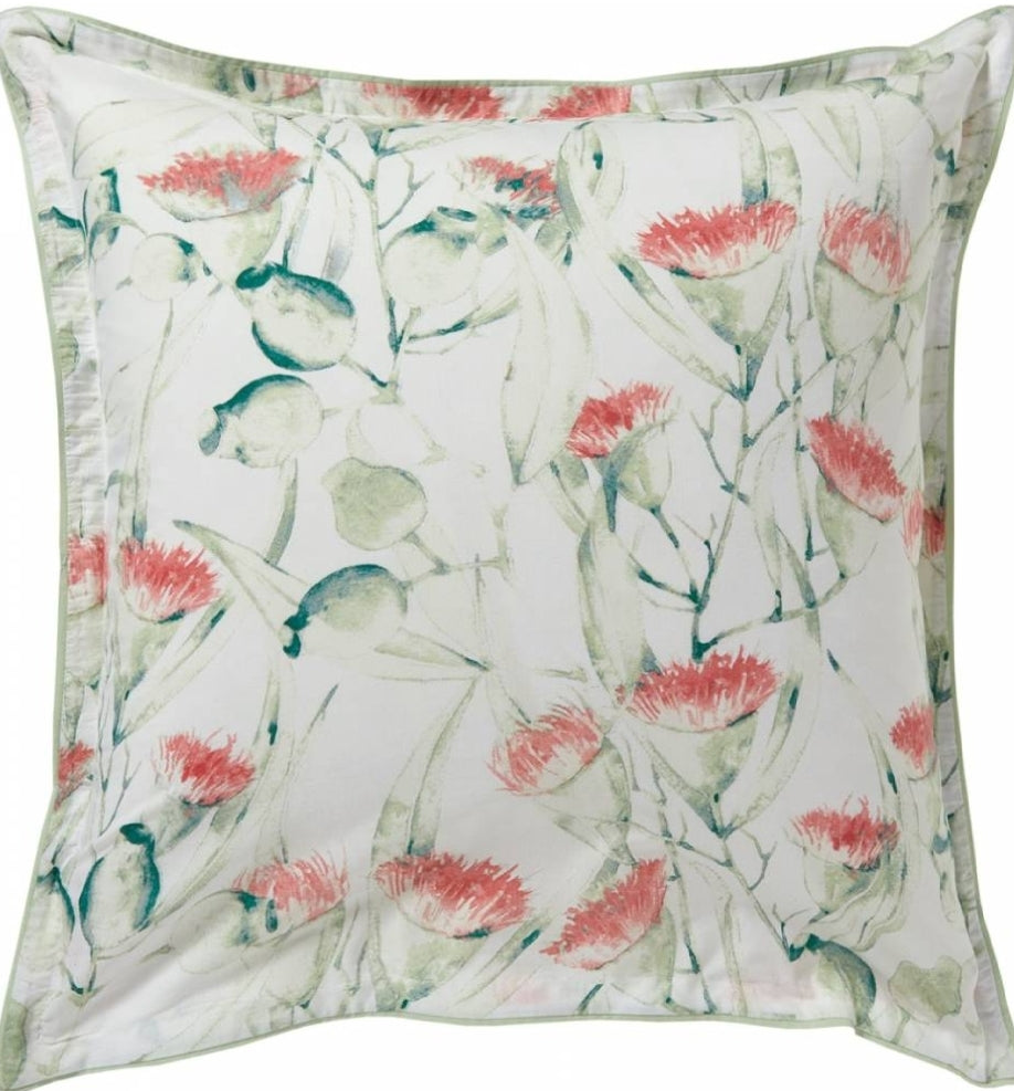 Gumnut 5 piece Queen Quilt Cover Set Range Green by Logan And Mason. Lifestyle brings a slice of Australiana to the bedroom. This artistic view of native flora showcases tapered leaves in soothing greens, with delicate pink blossoms and woody gumnuts. Finished with the repeated pattern on the reverse in small-scale for visual contrast.