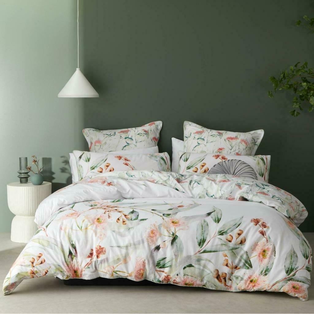 Gumnut Green brings a slice of Australiana to the bedroom. This artistic view of native flora features tapered leaves in soothing greens, with delicate pink blossoms and woody gumnuts. The pattern is repeated on the reverse in small-scale for visual contrast.
